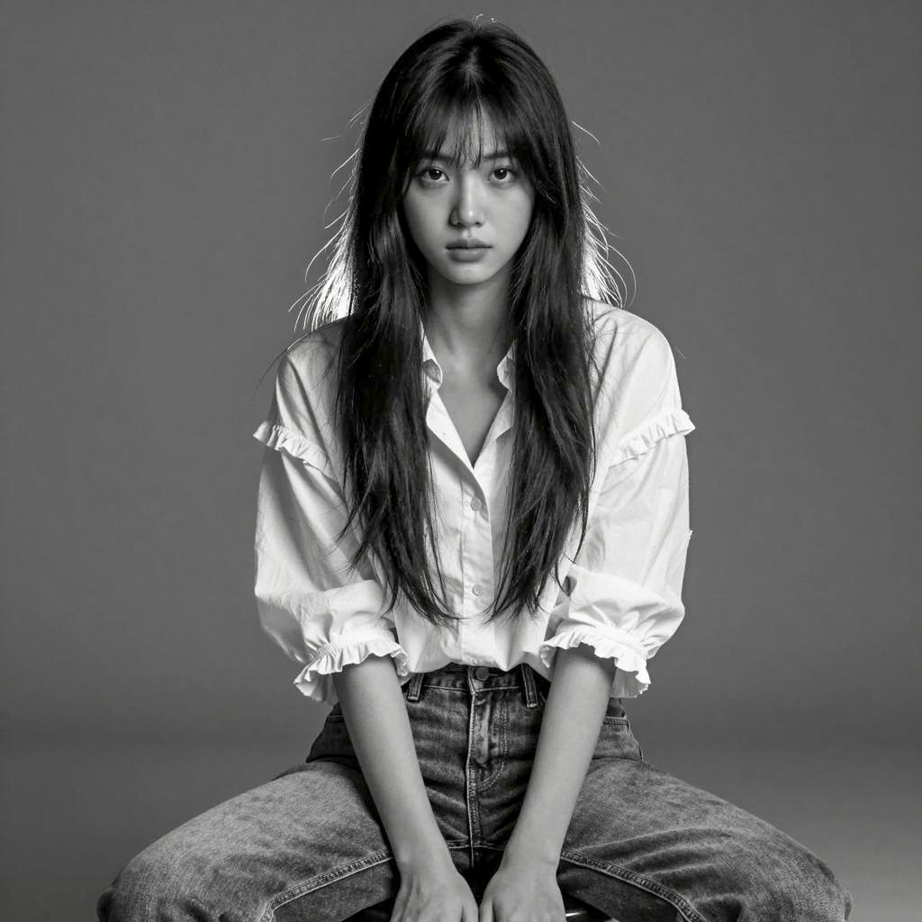 Black and white photograph. Man with beret and leather coat stands behind woman, adjusting her hood. Woman wears light-colored, hooded garment. Man holds camera to his eye. Both sit on ledge. Man's expression focused, woman's expression neutral. Background blurry, indistinct. Right side has large, draped fabric.