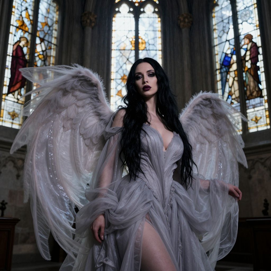 A striking woman in a moody gothic-inspired costume as the Moth Queen, with voluminous soft gothic powdery wings that fluff out like moonlit silk and gently tremble in the breeze, her face is serene and haunting with high cheekbones, deep burgundy lips, and long black hair cascading over one shoulder, standing in a dimly lit cathedral with cracked stained glass windows, rain falling softly, the wings reflecting the pale colors of the glass, natural lighting, realistic portrait photography. The woman has big tits and cute face