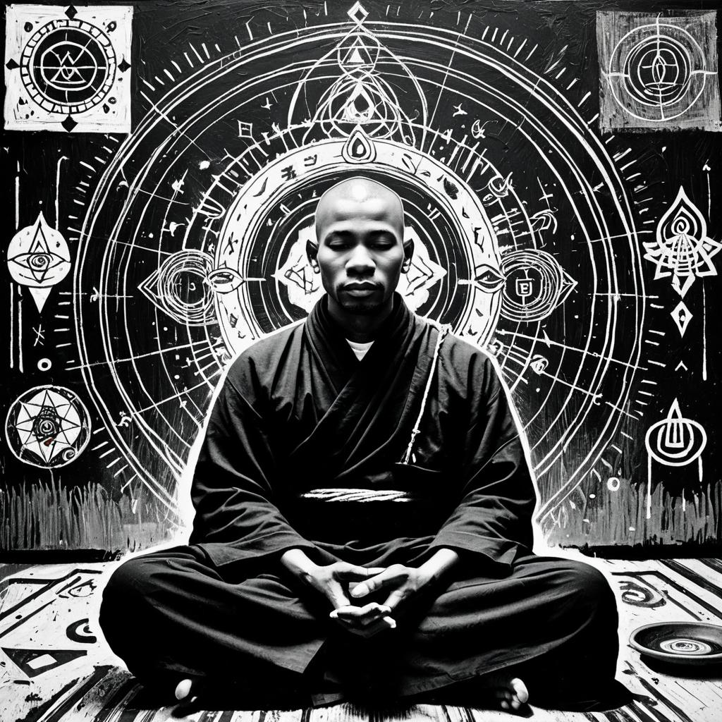 Black and white artistic depiction of a meditative monk seated cross-legged with eyes closed, wearing traditional dark robes. The background features intricate spiritual symbols and dynamic linework reminiscent of Basquiat's rough textures and energetic style, creating a powerful and reflective atmosphere.