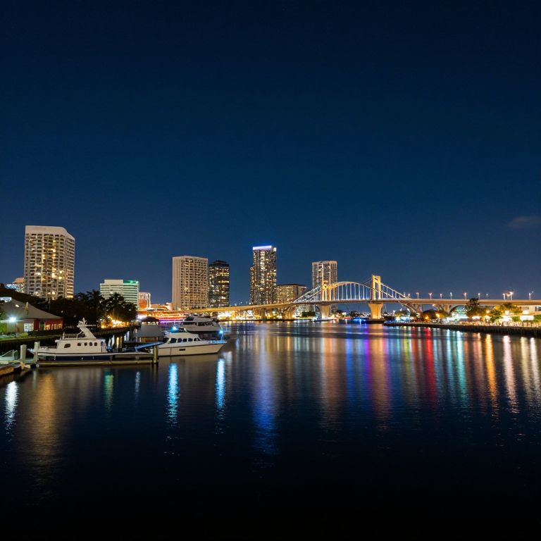 Jacksonville waterfront at night, glowing city lights reflecting on calm river waters, bridge illuminated with colorful lights, boats docked alongside piers, starry sky overhead creating a magical and inviting nighttime cityscape.