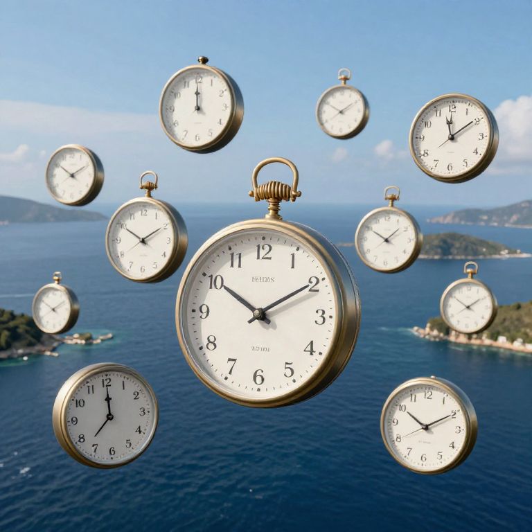 An archipelago of floating clocks drifts aimlessly, each ticking at a different pace, governed by the emotions of unknowing spectators.