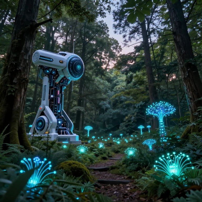 Photograph of a futuristic forest scene at twilight. A large, white, robotic surveillance camera with exposed blue-lit mechanical components stands on a dirt path, surrounded by dense, dark green trees. The forest floor is illuminated by glowing, bioluminescent mushrooms and plants in bright blue hues, creating an ethereal effect. The camera's design is sleek and modern, contrasting with the natural, organic surroundings. The background shows a dense forest with tall trees and a dimly lit sky. The scene blends sci-fi and nature, highlighting a surreal, otherworldly atmosphere.
