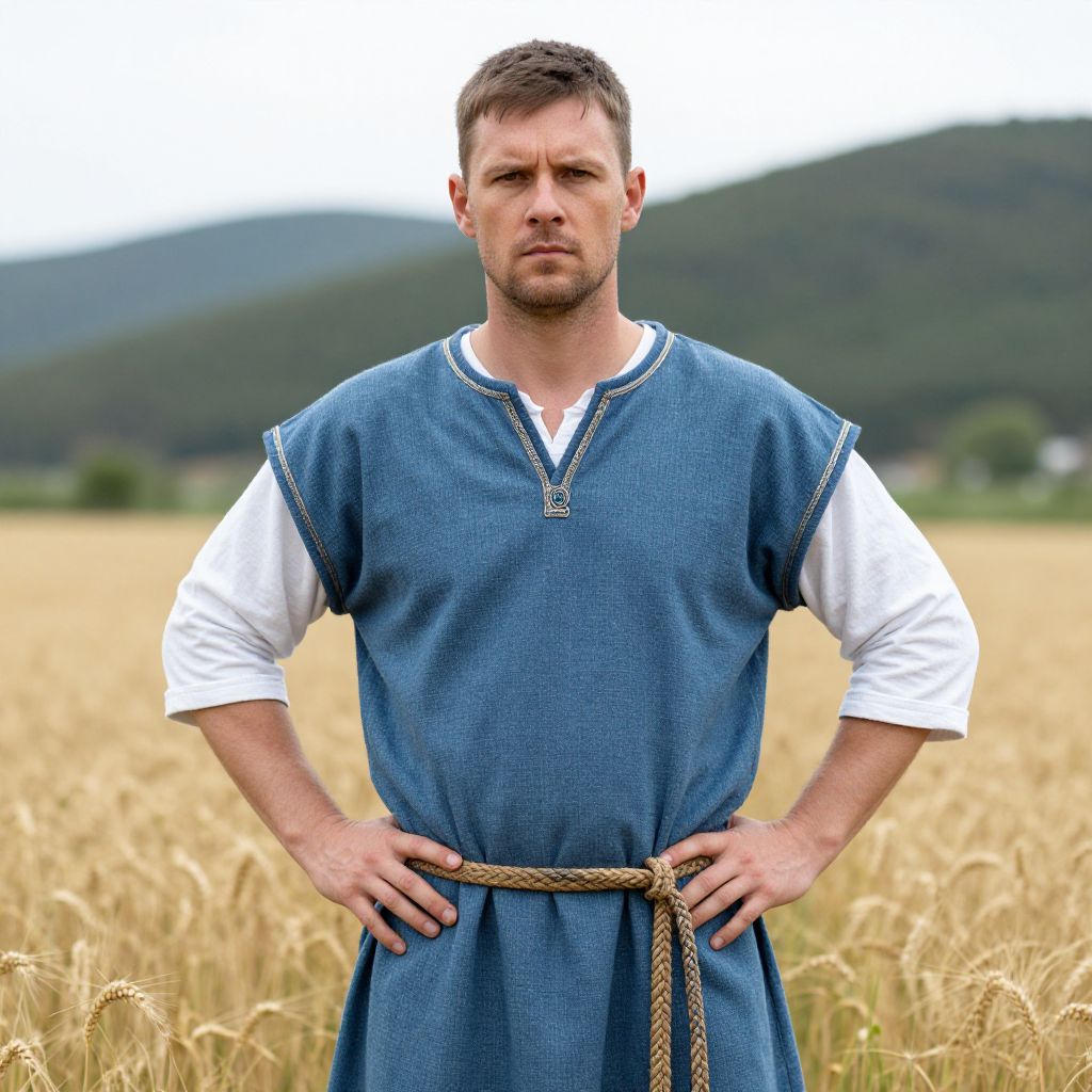 A photograph of a serious-looking, Caucasian man with short brown hair and light stubble, standing in a golden wheat field. He's wearing a blue, medieval-style tunic with a braided rope belt and white undershirt sleeves peeking out. The background features green, forested hills under an overcast sky. His hands are firmly placed on his hips.