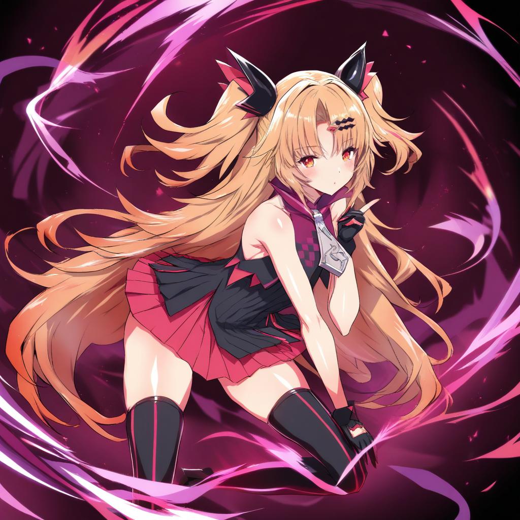 Akatsuki uni, uni create, 1girl, fang, red eyes, blonde hair, very long hair, long hair, two side up, parted bangs, hairclip, black gloves, black thighhighs, partially fingerless gloves, bare shoulders, virtual youtuber, virtual youtuber, by artist q azieru, animagine