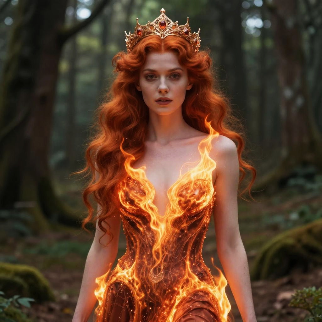 Aelin galathynius, elegant queen with fiery red hair in an enchanted forest, wearing a delicate crown and a gown made of flames, magical realism, soft glow, ethereal atmosphere