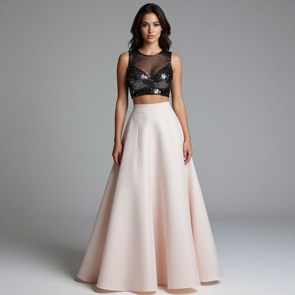 "Woman, modern formal, two-piece ensemble with a cropped top and ball gown skirt, top embellished with black sequins, illusion neckline, sleeveless, high-waisted skirt in soft pink fading to white, full-length with a gentle flare, plain background.. Sexy. Pretty face and beаutiful eyes. Big breasts."