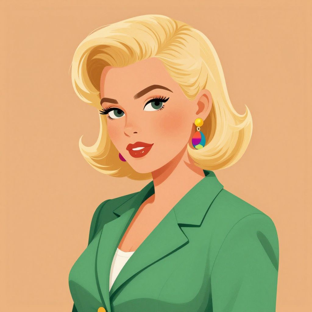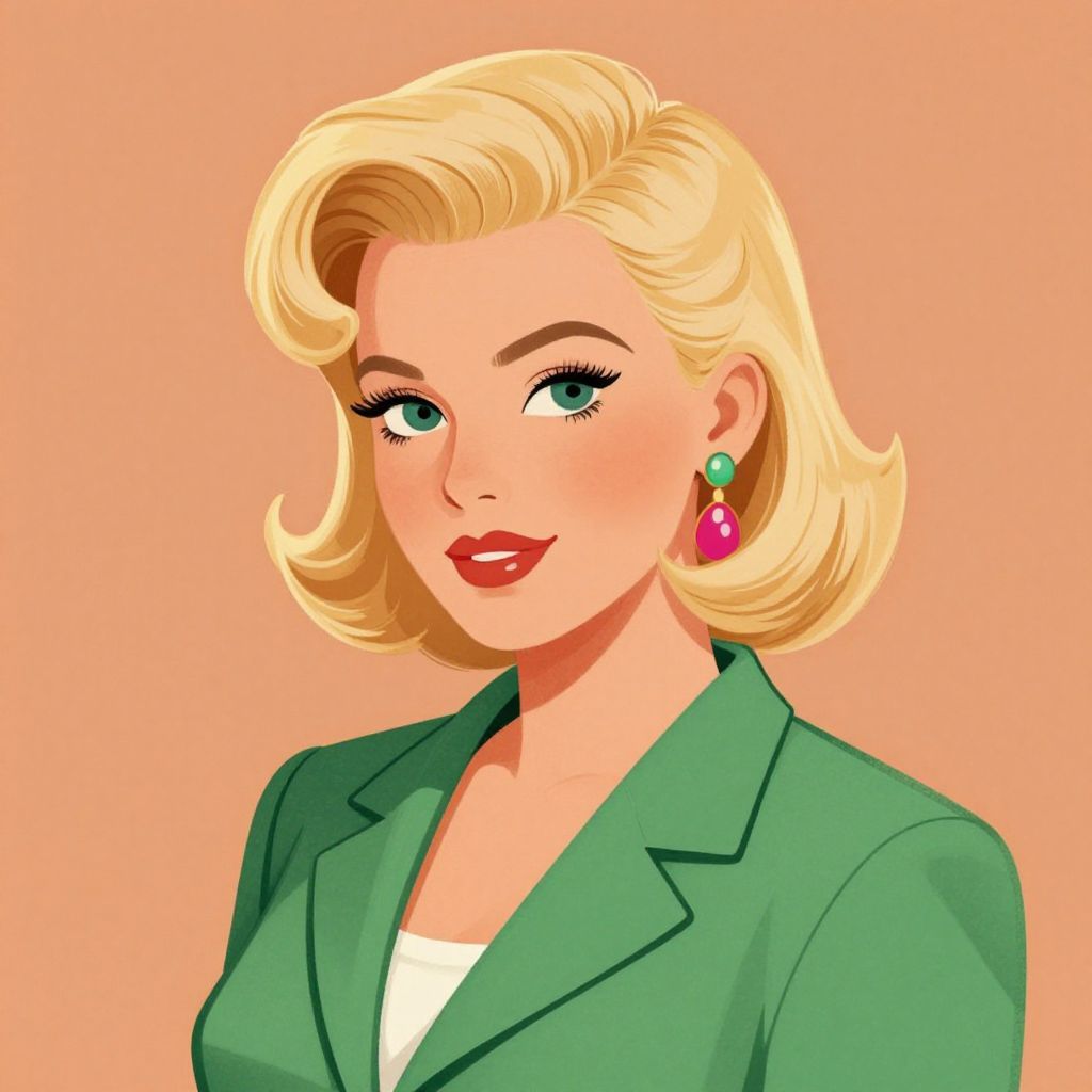 Digital illustration of a blonde woman with short, wavy hair, green blazer, white shirt, colorful earrings, red lipstick, and peach background.