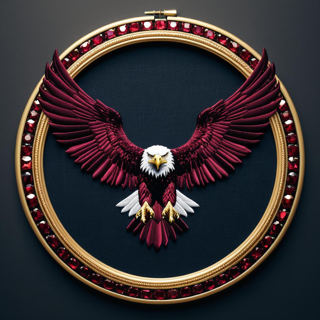 Embroidery Hoop circular shiny gold metallic frame, with front view eagle, wings on both sides, burgundy crystal at the bottom surrounded by wings, elite design, 3d render,