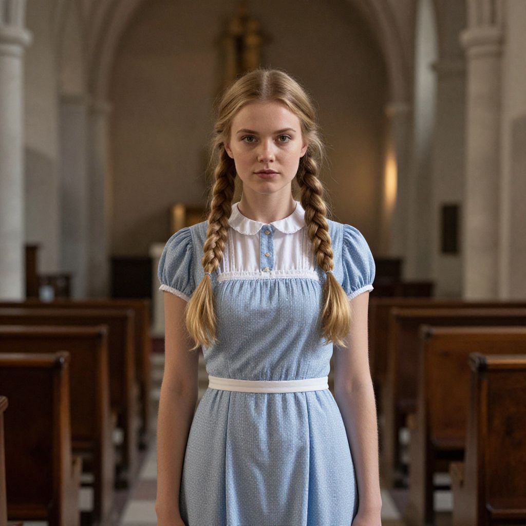 Woman hocus pocus classic, 1girl, solo, twin braids, braid, dress, long hair, church, blonde hair, looking at viewer, brown hair