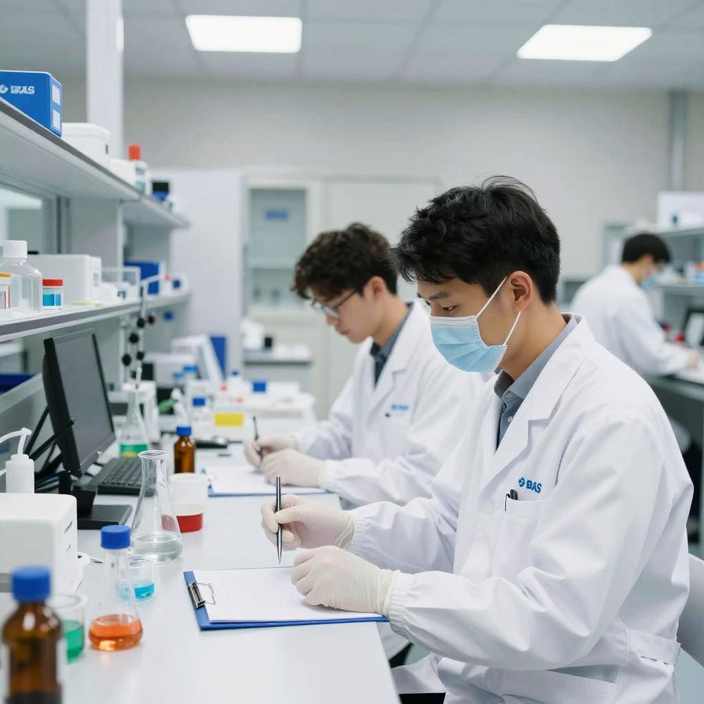 BASF laboratory interior with scientists in white lab coats conducting experiments, high-tech equipment and glassware, bright and clean environment, focused on innovation and precision, photorealistic style
