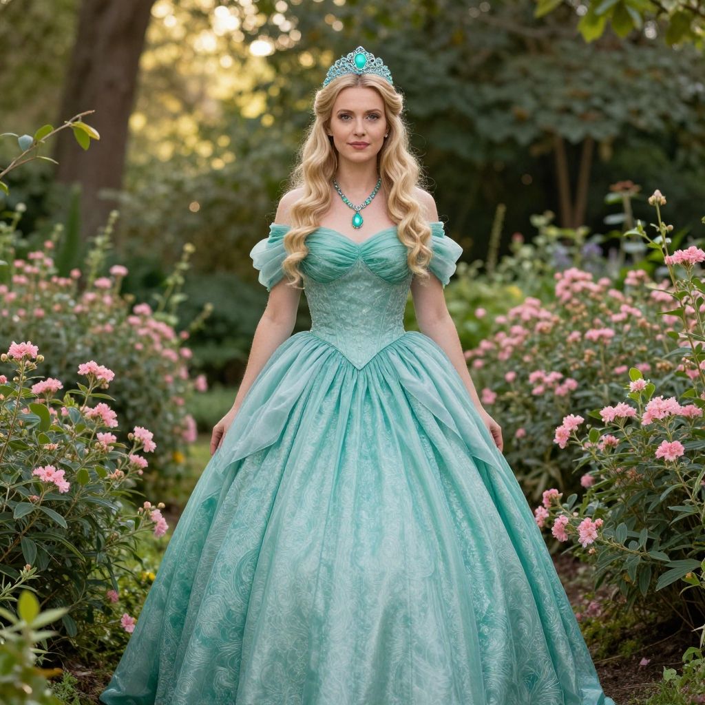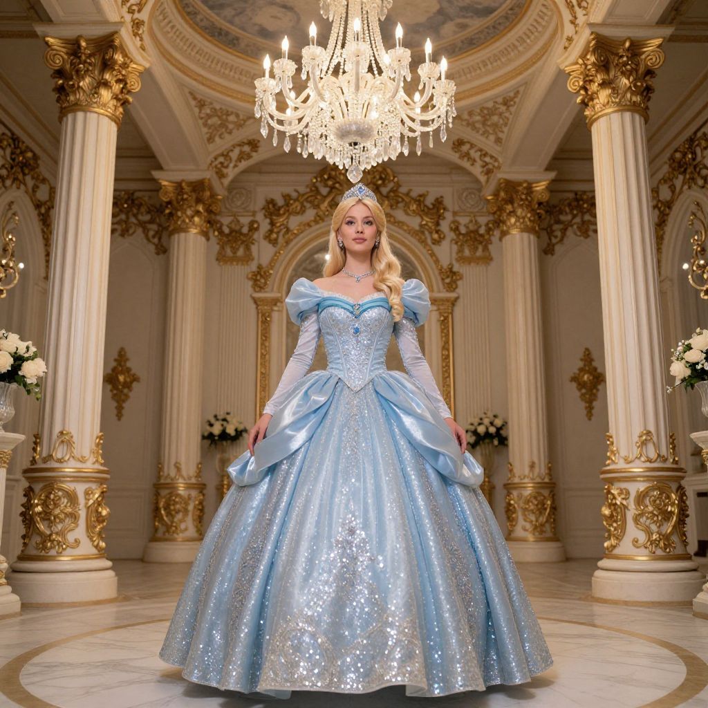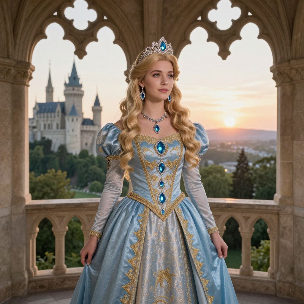 A young woman dressed as a princess wearing an elaborate blue gown with gold embroidery and large blue gemstones. She stands on a stone balcony of a medieval-style castle with gothic arches, overlooking a lush landscape with towering castles in the distance during sunset. The princess has long wavy blonde hair, a jeweled tiara, and matching earrings and necklace, conveying a regal and fantasy aesthetic.