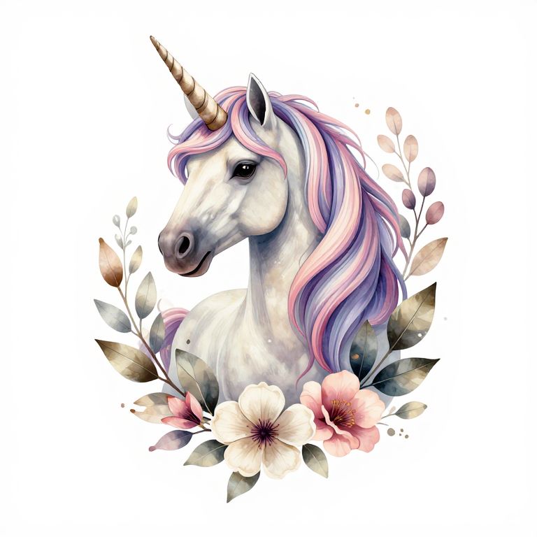 Digital watercolor of a white unicorn with a pink and purple mane, surrounded by pink and white flowers and green leaves.