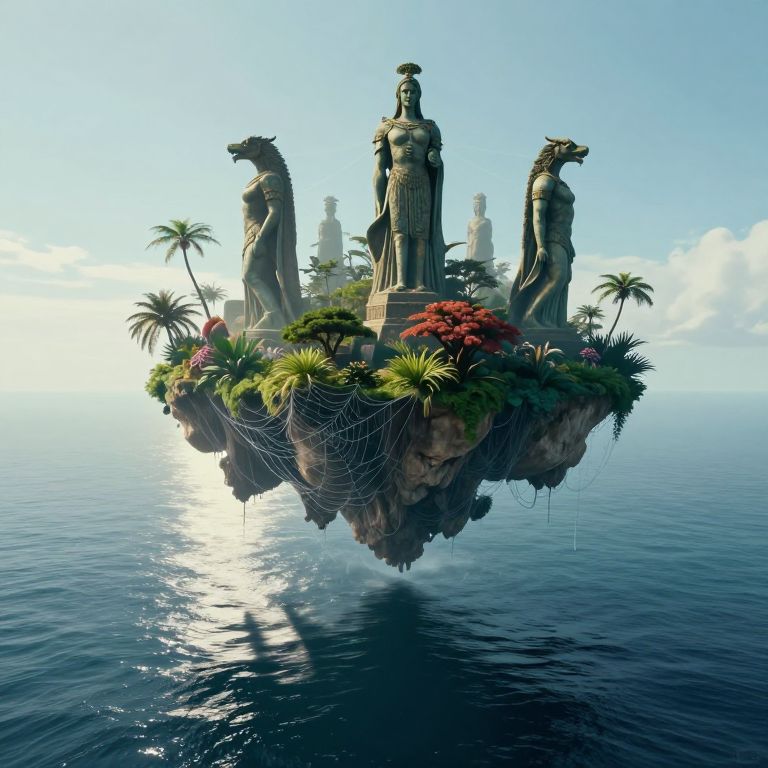 A digital CGI image depicts a floating island in a calm, blue ocean under a clear sky. The island is adorned with five statues of ancient, stone-like figures, each standing on a pedestal. Surrounding the statues are lush, green plants and vibrant red flowers. Palm trees and a spider's web are also present. The island's base is rocky and partially submerged, with sunlight reflecting off the water's surface. The overall scene combines fantasy and realism, evoking a serene yet mystical atmosphere.
