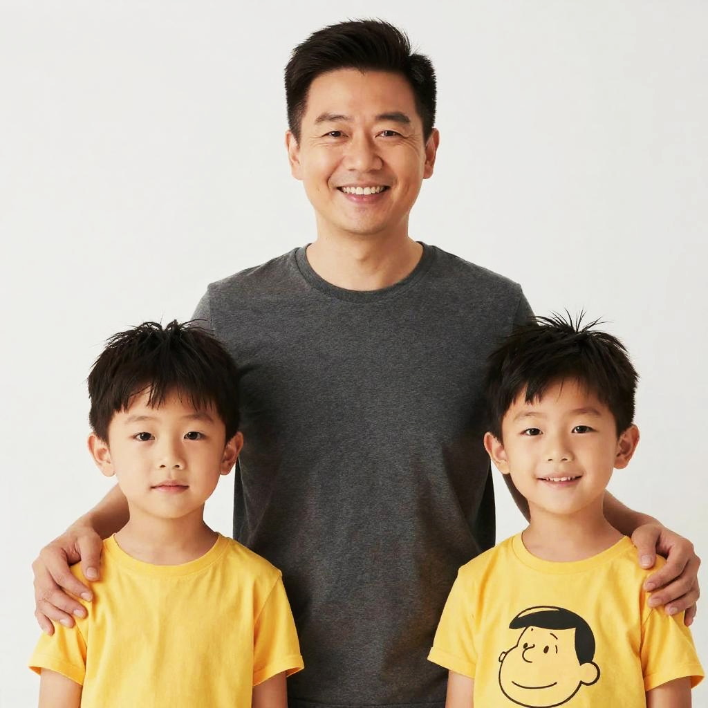Realistic photo.A family portrait of a father with two sons in a cartoonish art style inspired by Charles Schulz, Jim Davis. realistic photo