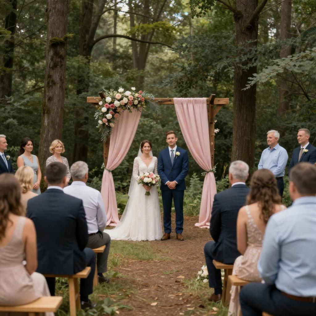 Photograph of an outdoor wedding ceremony. Guests sit on wooden benches in a forest clearing. Bride and groom stand before a rustic wooden arch with pink curtains, surrounded by flowers. Groom in blue suit, bride in white dress. Neutral facial expressions. Tall trees in background. Flora on ground. Multiple guests, mixed attire, attentive. Man in blue shirt on right. Natural light.