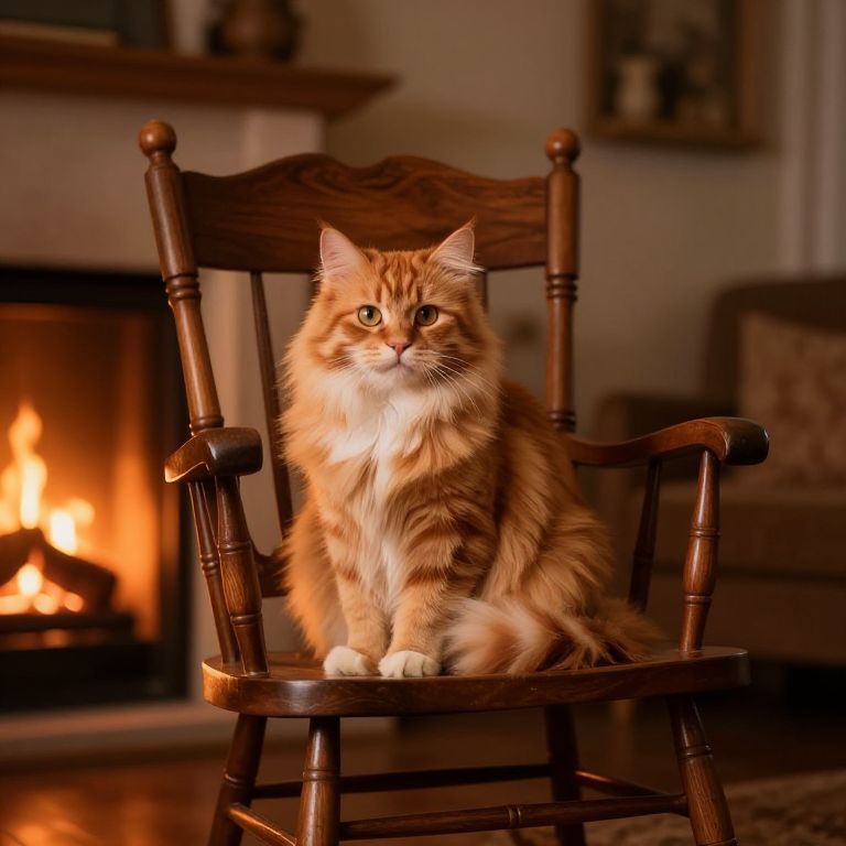 A fluffy orange tabby cat sitting comfortably in a vintage rocking chair by a fireplace, warm glow highlights its fur, cozy home interior with rustic decorations, highly detailed textures on wood, fabric, and fur, warm inviting atmosphere
