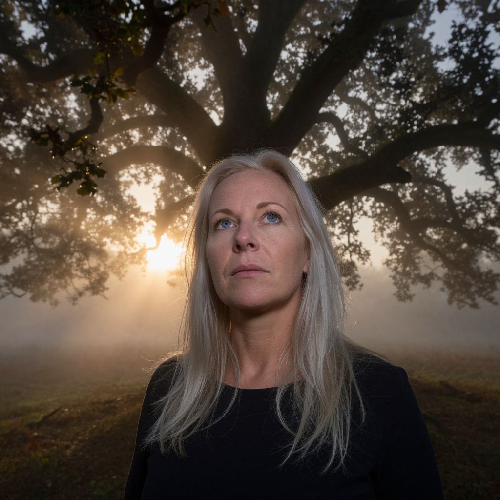 This photograph features a middle-aged woman with long, straight, silver-blonde hair, pale skin, and blue eyes. She wears a simple black top and stands centered against a dramatic natural backdrop. The background showcases a large, dark tree with sprawling branches and leaves, silhouetted against a golden sunrise or sunset. The sunlight filters through the leaves, creating a halo effect around the woman's head and casting soft, warm light. The atmosphere is misty, adding a mystical, ethereal quality to the scene. The woman's expression is calm and introspective, enhancing the serene, almost magical mood of the photograph.
