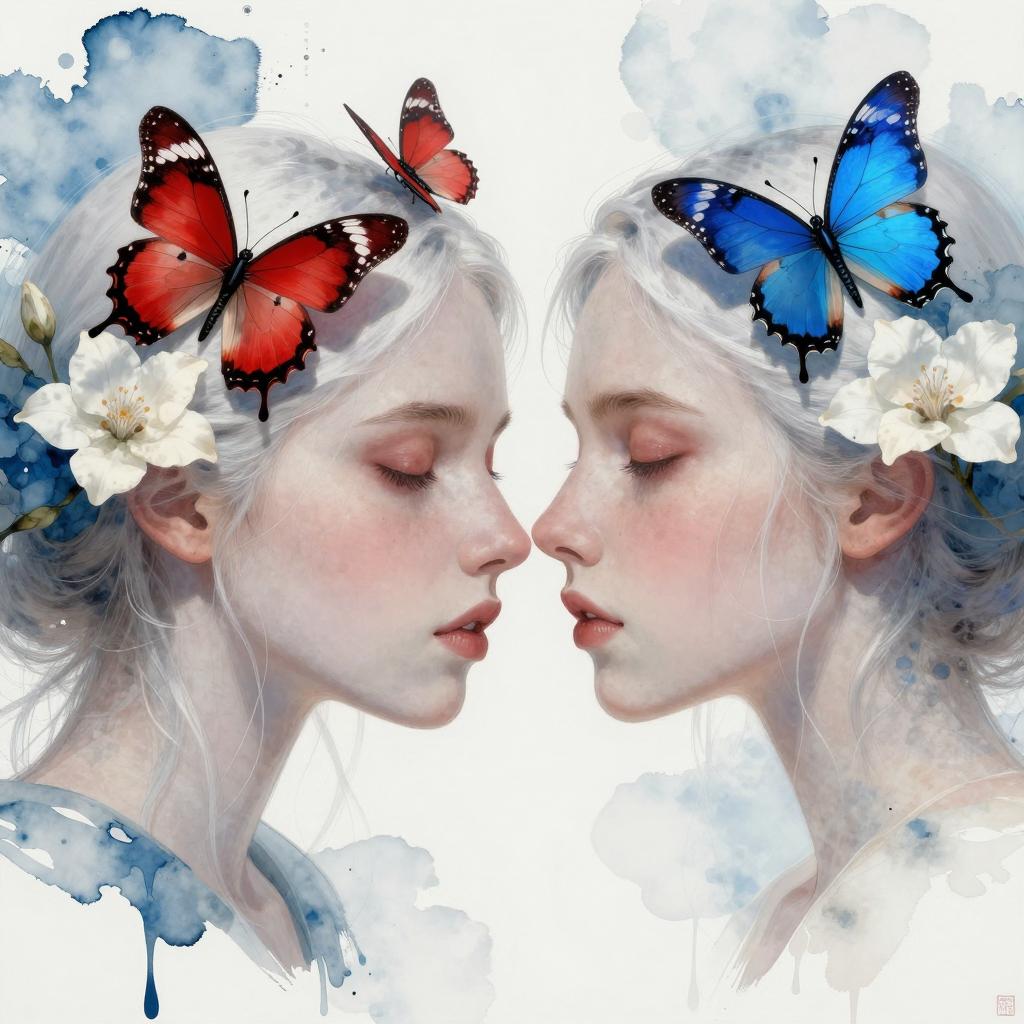 Dreamlike digital illustration of two women facing each other with their eyes closed, both having fair skin and serene expressions. One woman has long blonde hair adorned with small flowers, and the other has long orange hair also decorated with flowers. Their shoulders and upper arms are partially visible, covered with colorful floral patterns. The background features soft blue and green tones with intricate circular and floral designs, enhancing the ethereal and gentle atmosphere.