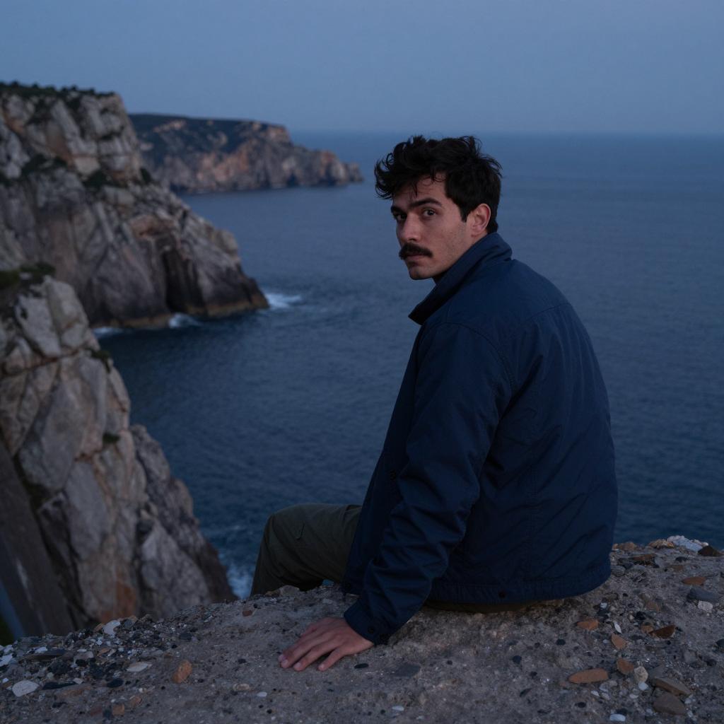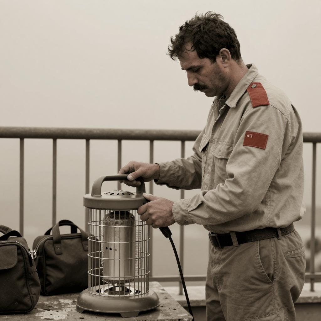 A man with dark hair and a mustache dressed in a beige uniform with red patches on the shoulders and sleeve, is using a portable heater placed on a weathered surface outdoors. Metal railings are visible in the background, and there are two black bags next to the heater. The image has a sepia tone.