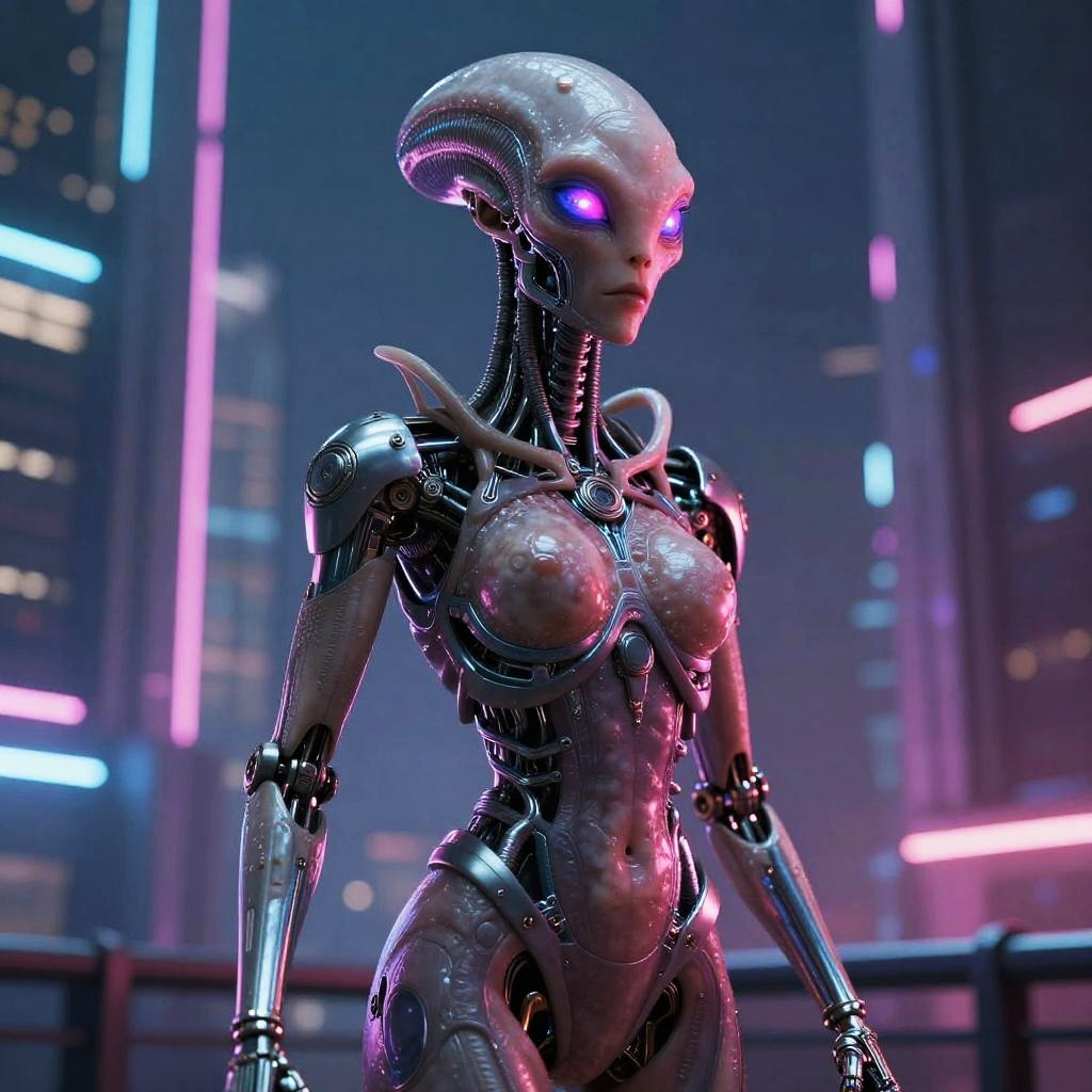 Half human half alien standing in a futuristic cityscape under a neon sky, glowing eyes and intricate bio-mechanical textures blending flesh and metal, cinematic lighting.