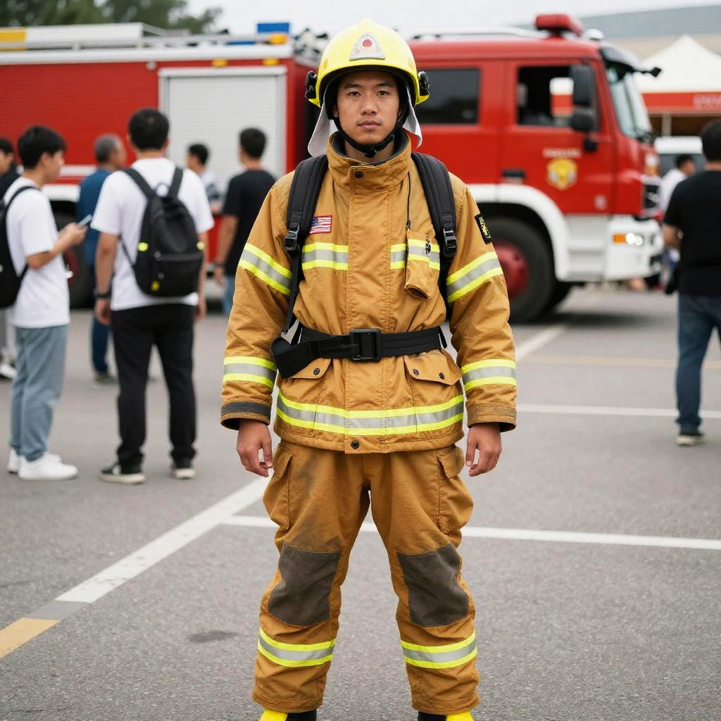 A man dressed in a traditional firefighter costume poses confidently at a cosplay festival. The background features a crowd of people and a bright red fire truck, highlighting the event's lively atmosphere.