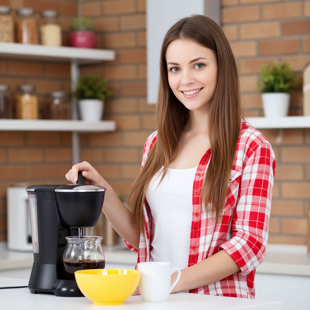 Photograph of a smiling young woman with long, straight brown hair and fair skin. She's wearing a red and white plaid shirt over a white tank top, standing in a bright, modern kitchen with a brick wall background. She's holding a black coffee maker on a white countertop, with a yellow bowl and white cup nearby. Shelves with jars and potted plants are visible in the background.