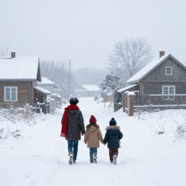 Photograph of a snowy village path flanked by tall, snow-covered evergreen trees. Three people, two in black and one in red, walk away from the camera, leaving footprints in the snow. To the left are dark green, two-story houses with snow-laden roofs and stone accents. The overcast sky is light gray, blending with the snowy landscape. The path extends into the distance, bordered by more trees and houses, creating a serene, wintery atmosphere.