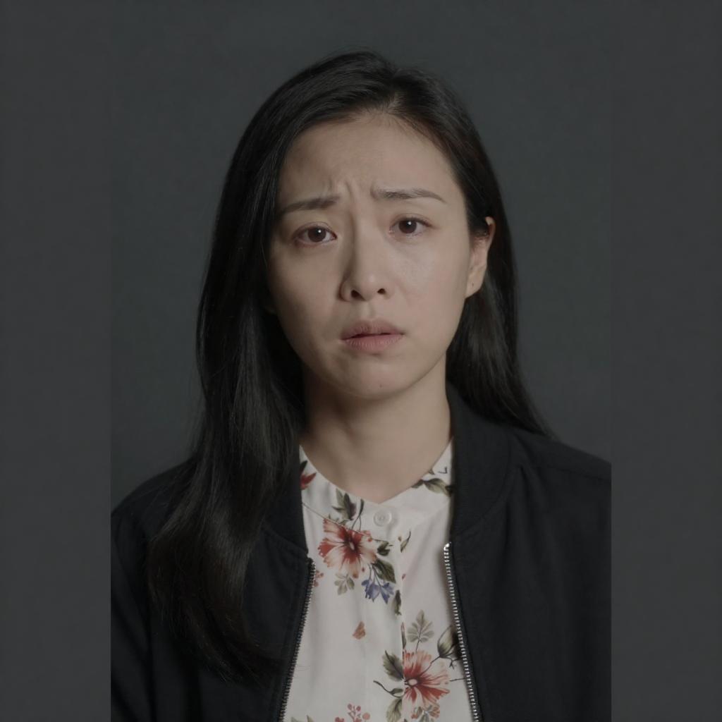 Photograph of an Asian woman with long black hair, wearing a black jacket over a white floral shirt, against a dark background. She has a neutral, slightly concerned expression. Black background, gray borders. One person.