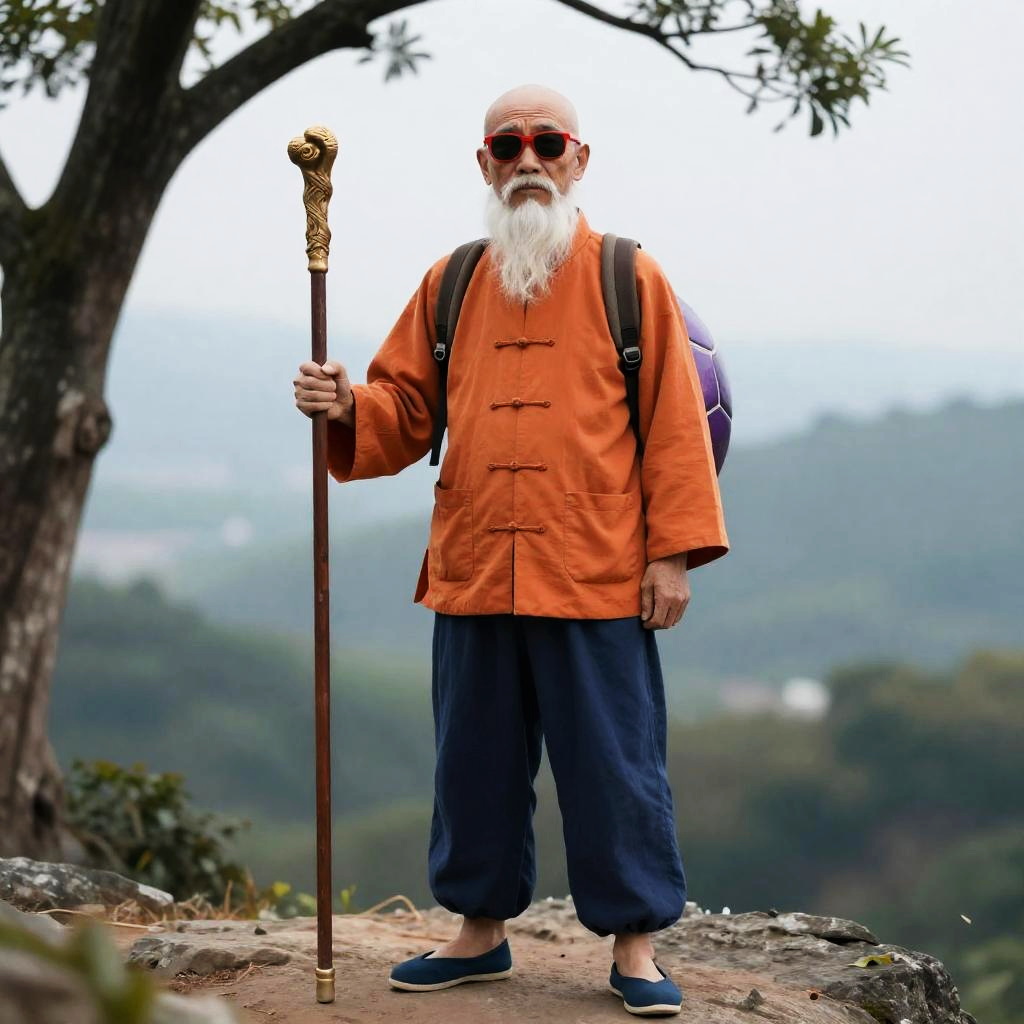 Best quality, masterpiece, realistic, photorealistic, muten roushi, facial hair, 1boy, male focus, solo, ((chinese clothes)), bald, old man, beard, sunglasses, white hair, (purple turtle shell), mustache, arm behind back, standing, full body, (holding staff), red-framed eyewear, orange jacket, (blue pants), cliff, tree, blue flats, backpack, (brown staff), long sleeves