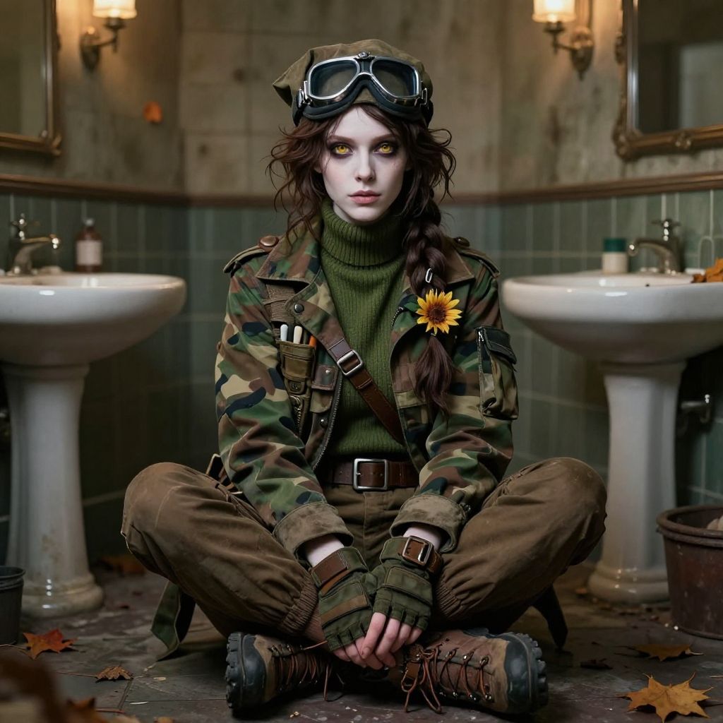 This digitally created image features a pale-skinned woman with dark, wavy hair and intense, dark eyes, sitting cross-legged on a tiled bathroom floor. She wears a camouflage military jacket adorned with a sunflower pin, brown cargo pants, and brown boots. A pair of aviator goggles rests on her head. She is also dressed in a green turtleneck and brown fingerless gloves. The bathroom has two white porcelain sinks with metal faucets against a tiled wall, and two wall-mounted light fixtures with yellowish bulbs. Fallen autumn leaves are scattered on the floor, adding a touch of nature to the gritty, urban setting.
