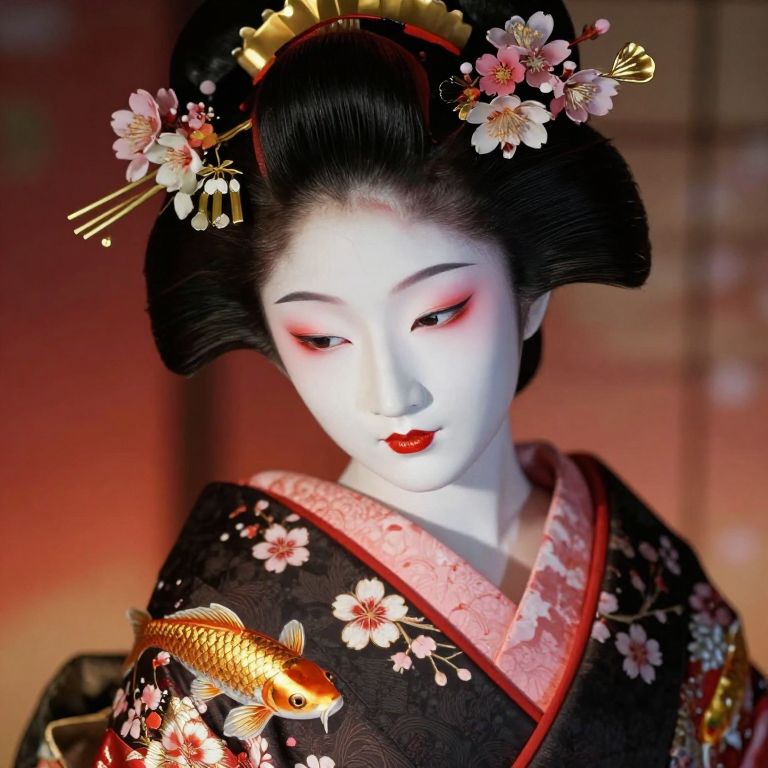 Craft a hyperrealistic digital illustration of a Japanese geisha with porcelain skin and intricate red-gold facial paint. Capture her from an unconventional bug's-eye view perspective, showcasing her meticulously styled black hair adorned with delicate floral accessories. Highlight the golden koi fish swimming among cherry blossoms on her exquisite kimono fabric, emphasizing the interplay between light-catching threads and shadow patterns. Convey an emotional gradient that transitions from awe at the craftsmanship to an intimate connection with her enigmatic expression and refined beauty.