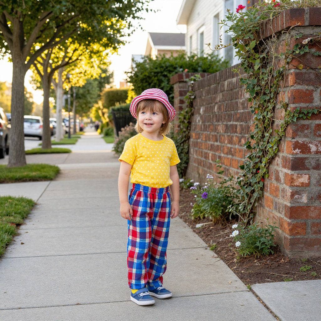 A happy child, around 6 years old, wearing a vibrant and colorful outfit with a classic plaid pattern—bright red and blue checked pants, a yellow polka-dot shirt, and a red and white striped hat—is standing on a sunny sidewalk. The scene is set in a suburban neighborhood during early afternoon, with soft sunlight filtering through the trees. Behind the child, a weathered brick wall rises gently, covered in climbing ivy and small flowering plants. The background includes a few passing cars and a distant streetlamp, adding to the warm, nostalgic atmosphere. The child is looking slightly to the side with a curious smile, as if noticing something interesting in the distance.