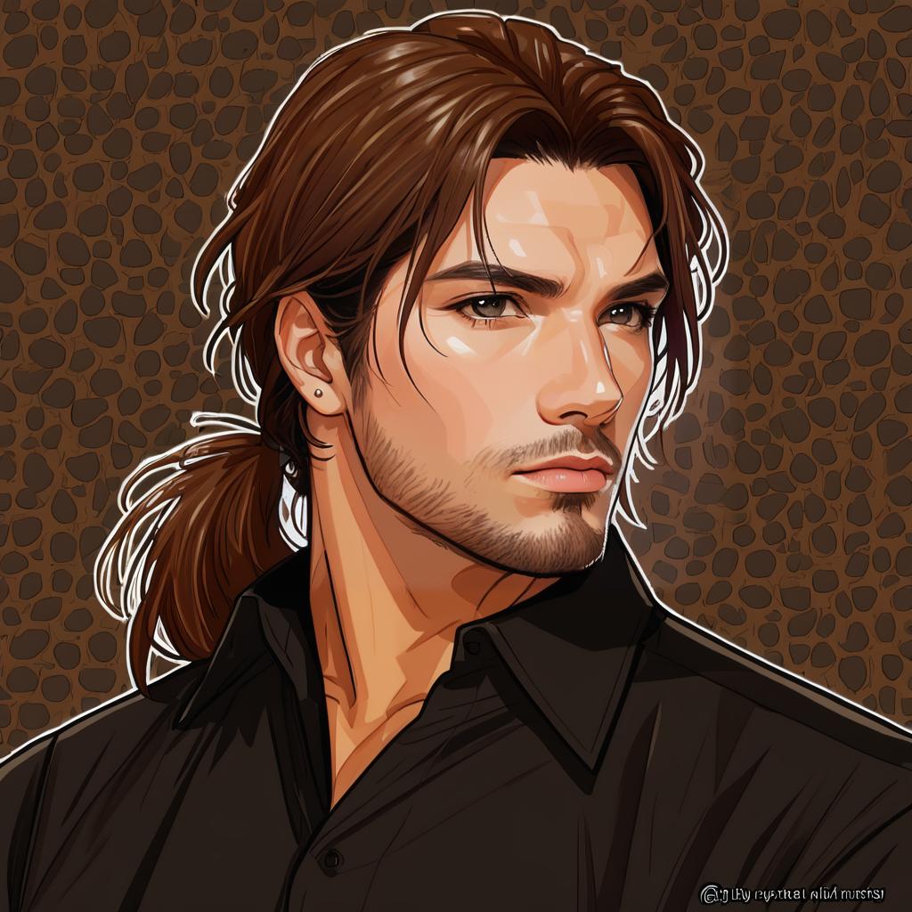 Belmond banderas, nijisanji, 1boy, brown eyes, thick eyebrows, brown hair, long hair, parted bangs, ponytail, low ponytail, collared shirt, black shirt, long sleeves, virtual youtuber, virtual youtuber, stubble, by artist monety, anime