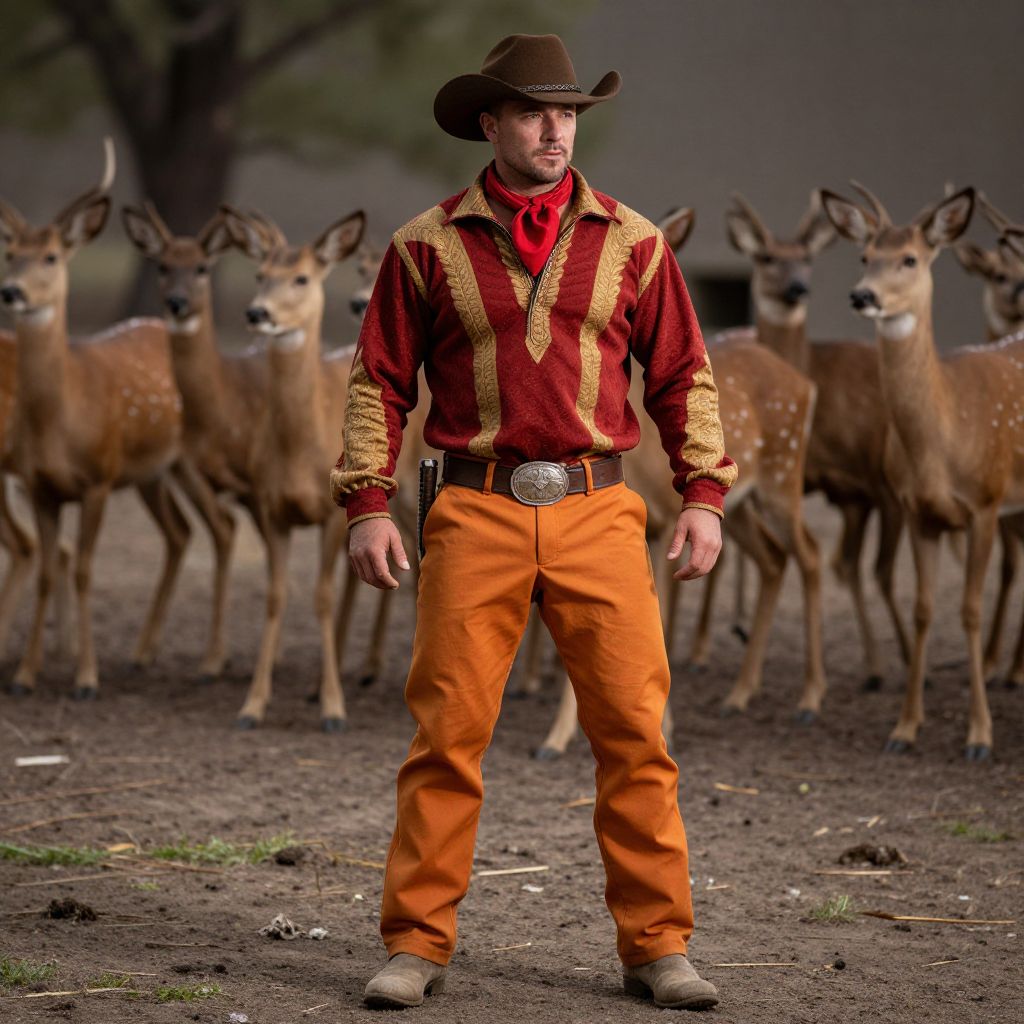 Photograph of a rugged cowboy in a brown hat, red embroidered shirt, and orange pants, standing confidently in front of a group of deer in a