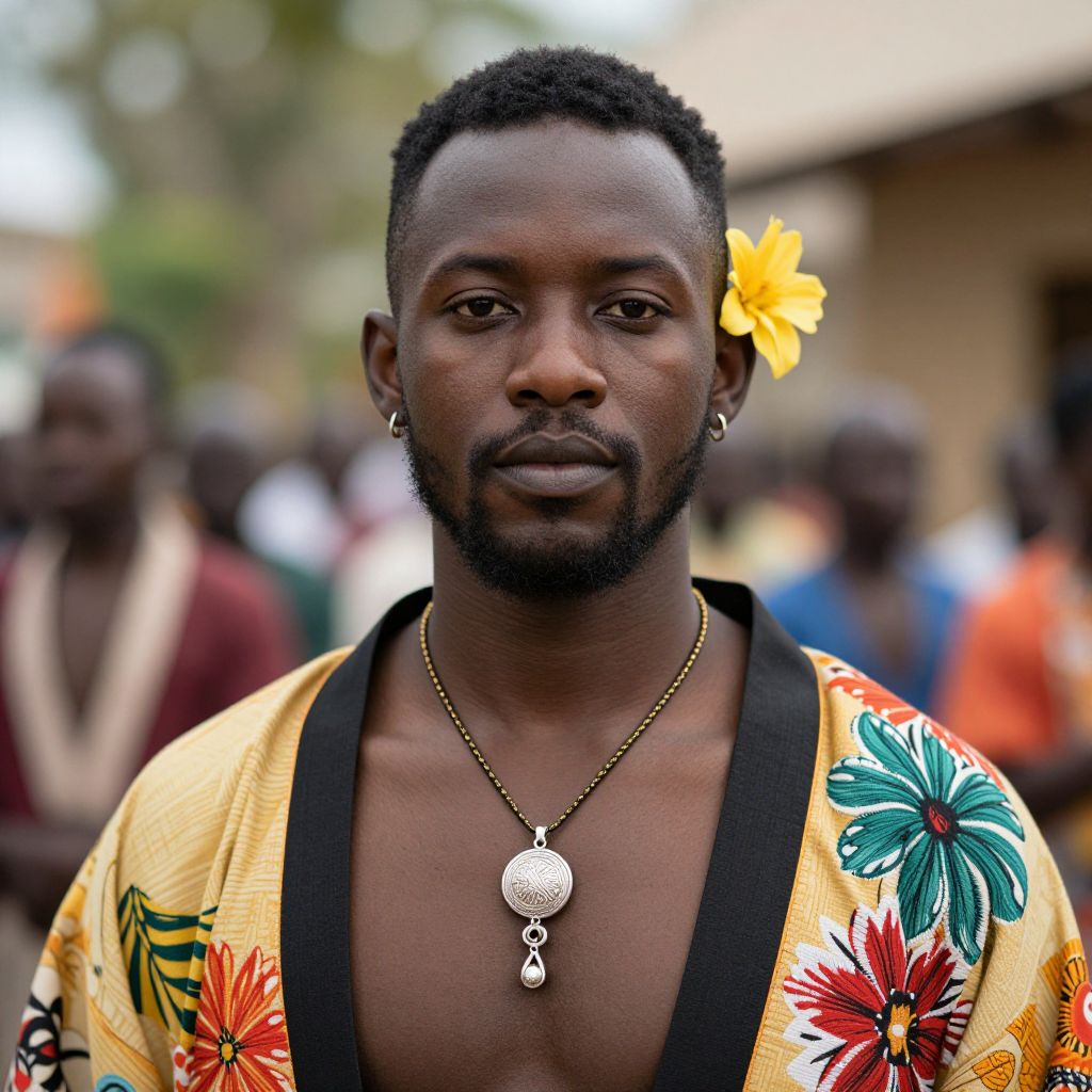 Photograph of a muscular, dark-skinned African man with a short, neatly trimmed beard and short black hair. He wears a vibrant, yellow floral-patterned shirt with black trim, exposing his chest and a silver pendant necklace with a round, textured medallion and small teardrop charms. A bright yellow flower adorns his left ear. He stands against a blurred background of people, including one in a red shirt, with greenery and a brown building visible. His expression is serious, and he gazes directly at the camera. The image is sharply focused on the subject with a shallow depth of field.