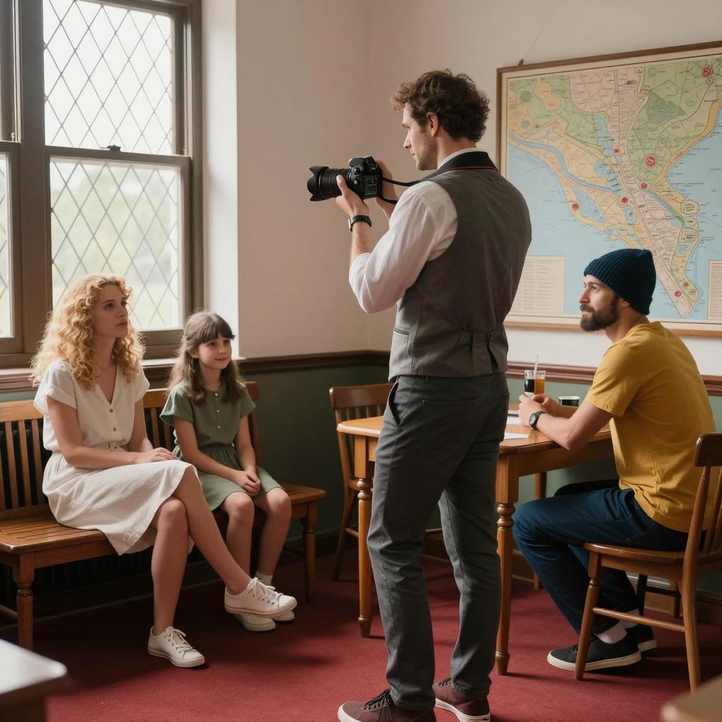 An indoor scene with four people. A man in a gray vest and white shirt, with a camera raised, stands in the center, facing left. A woman with curly blonde hair, wearing a white dress, sits on a wooden bench to the left. A young girl with brown hair, wearing a green dress, sits beside her. A man with a blue beanie, yellow shirt, and blue pants sits at a table on the right. The room has a red carpet, wooden furniture, and a large map on the wall. Sunlight filters through diamond-patterned windows.