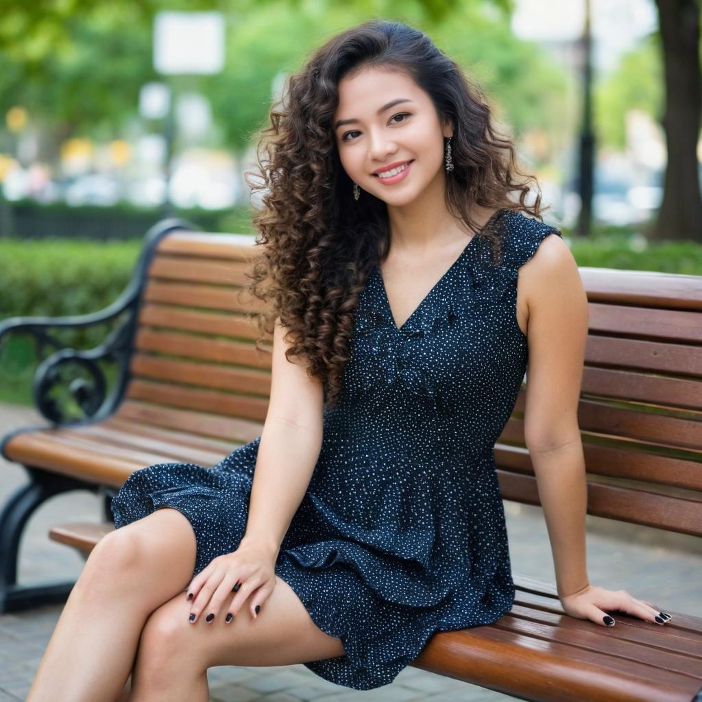 1girl, long hair, sitting, black hair, realistic, crossed legs, black nails, head tilt, looking at viewer, solo focus, blurry, photorealistic, blurry background, bench, smile, nail polish, curly hair, photo background, dress, black eyes, lips, solo, outdoors, asian, brown eyes