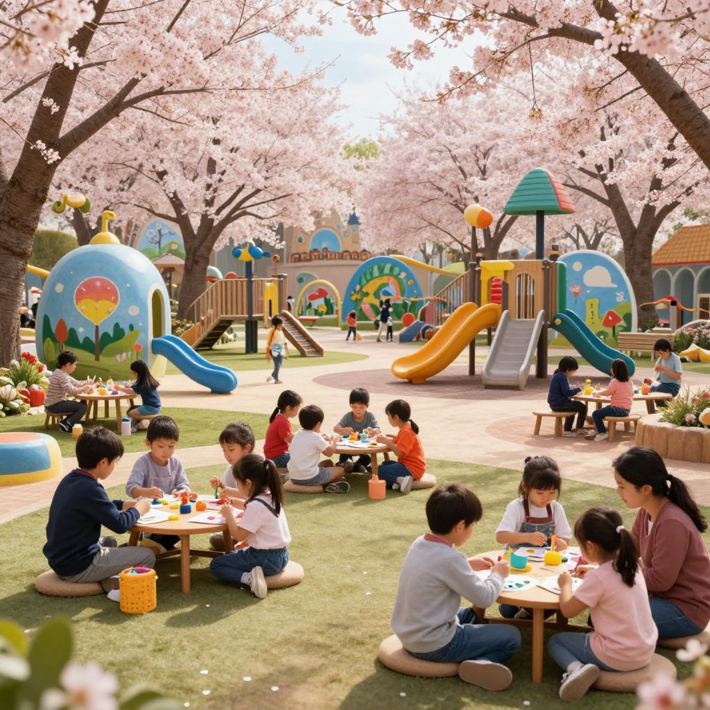Photograph of a vibrant, outdoor children's playground under a canopy of blooming cherry blossom trees. Children, both boys and girls of various ages, sit on the grass and wooden benches, engaging in activities like coloring and eating snacks. The playground features colorful, inflatable slides, climbing structures, and a blue-and-yellow playhouse. The kids wear casual clothes in bright and neutral colors. In the background, more children play on the slides and swings. The sunlight filters through the cherry blossoms, casting a warm, inviting glow over the scene. The grass is well-maintained, and the area is surrounded by trees and additional playground equipment.