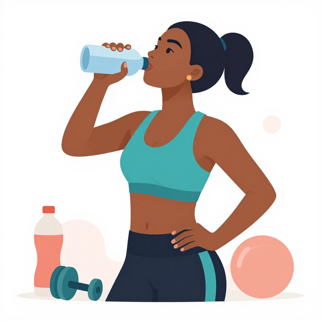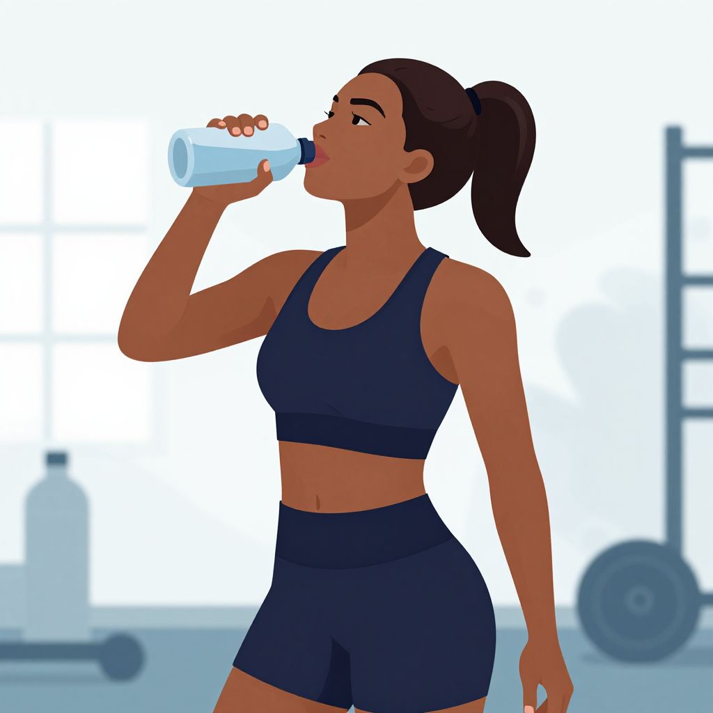 Digital illustration of a dark-skinned woman with a ponytail, drinking from a water bottle in a gym, wearing a black sports bra and shorts.