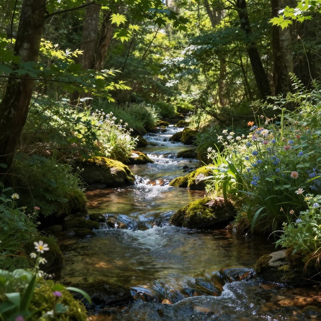 Forest aesthetics featuring a tranquil scene where a crystal-clear stream winds through a verdant forest, surrounded by lush foliage, wildflowers blooming nearby, and gentle rays of sunlight dappling the water surface, emphasizing harmony in nature.