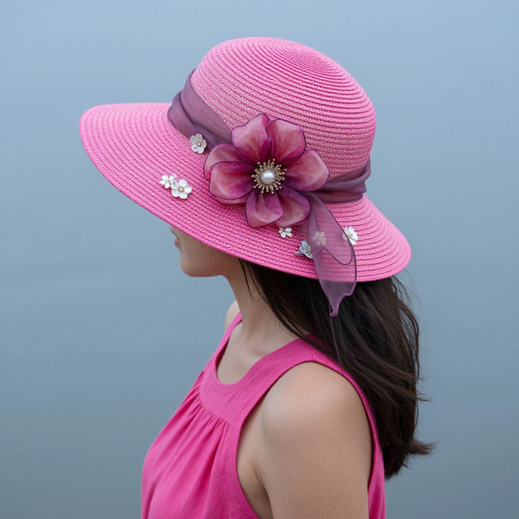 Photograph of a woman in profile wearing a pink straw hat adorned with a large pink flower and small white flowers, paired with a pink sleeveless top