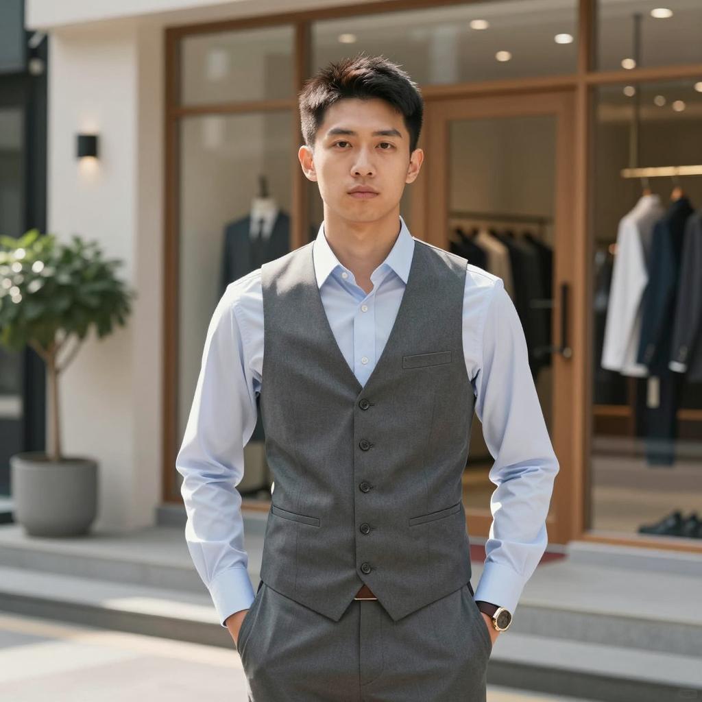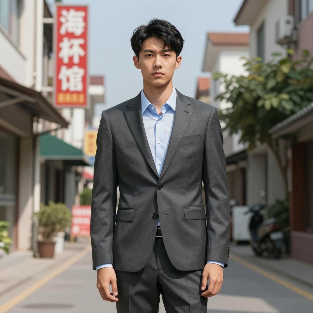 A confident Asian man wearing a tailored blue suit with a white shirt and striped tie. He has short black hair and is clean-shaven, standing outdoors in daylight against a brick building background. He holds his suit lapel with one hand and has a slight smile. The setting includes a red sign and a green plant, with natural sunlight casting shadows.
