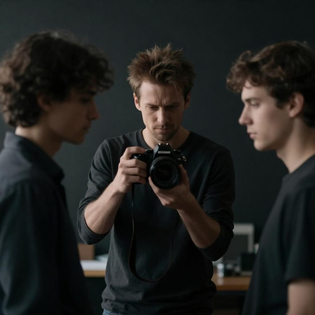 Photograph of four men standing in a row outdoors. All have cameras and camera bags. Three men have arms around each other's shoulders. Left to right: bearded man in dark vest, man with sunglasses in gray vest, curly-haired man with dark vest, man with light shirt. Overcast background, blurred trees and buildings. Intense expressions. Casual clothing, jeans and short-sleeved shirts.