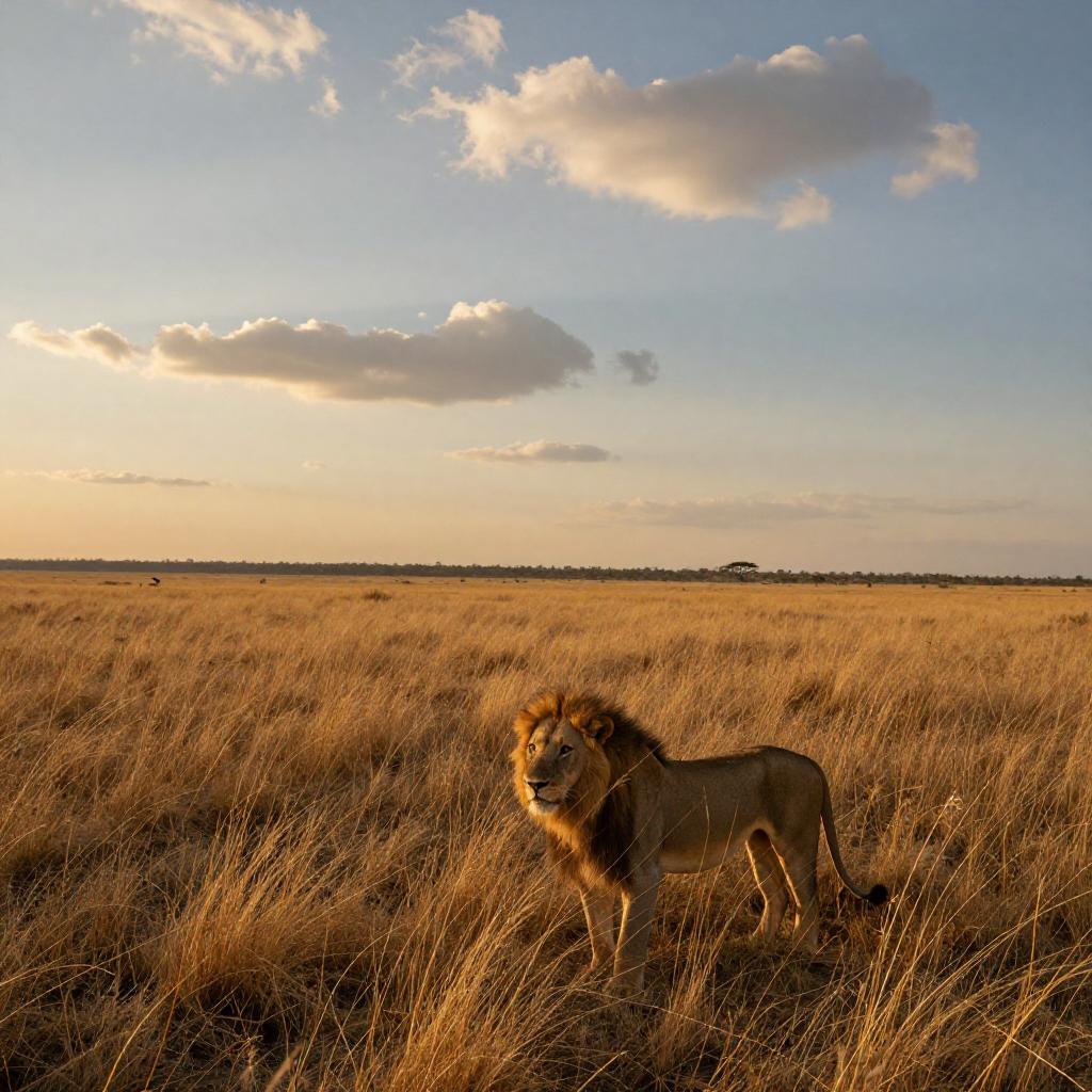 Photograph of a vast savanna at sunset. A lone lion with a tawny coat and dark mane stands partially hidden among tall, golden grasses in the foreground. The background features a distant treeline under a sky filled with scattered clouds, transitioning from blue to orange hues. The landscape is dry and expansive, evoking a sense of wild beauty.