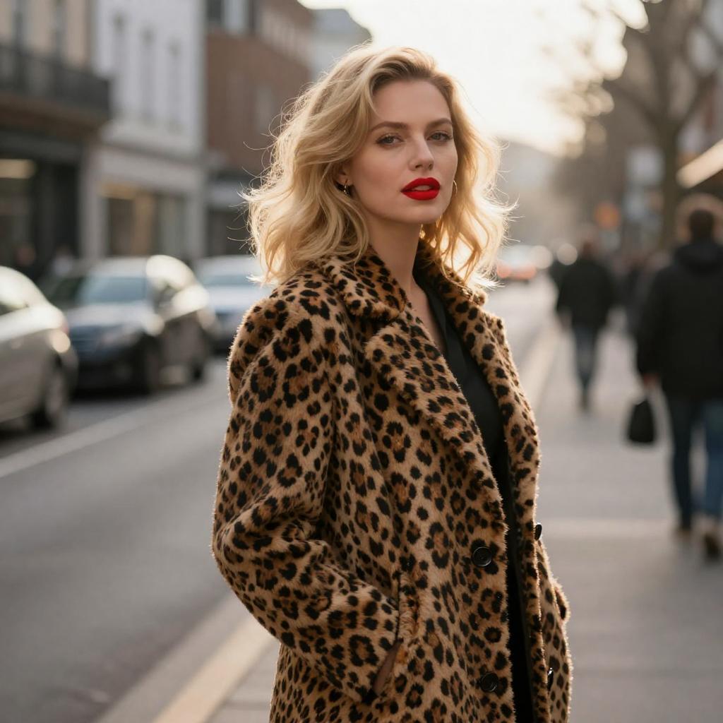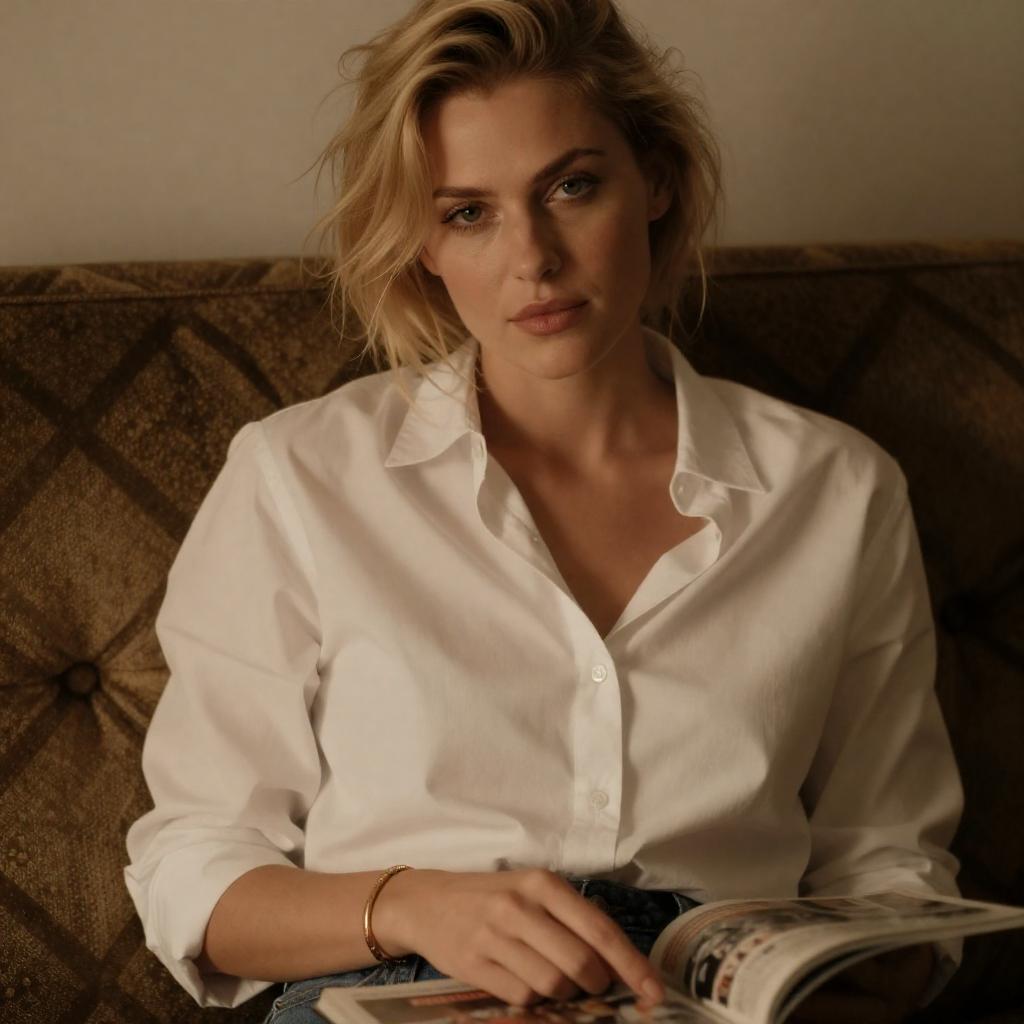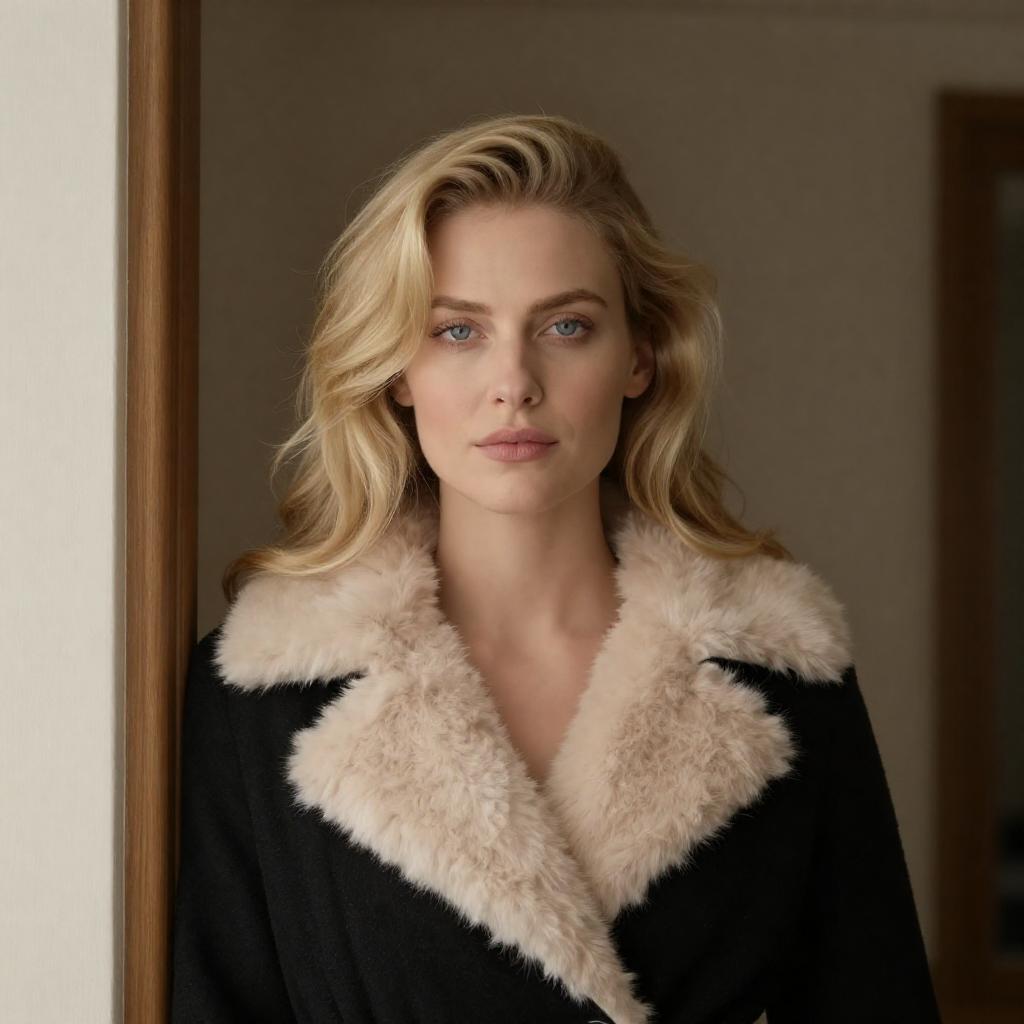 Photograph of a blonde woman with wavy hair, wearing a black coat with a fluffy beige collar, standing in a doorway. She has fair skin, blue eyes, and a neutral expression. The background includes a ured brown wall and a partially visible wooden frame. Light from the doorway illuminates her face.