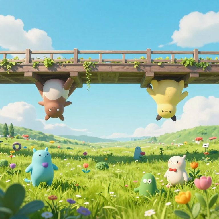 Photorealistic digital CGI image of a vibrant, sunny meadow with a wooden bridge overhead. Two cute, round, cartoon-like creatures, one brown and one yellow, hang upside-down from the bridge by their ears. The meadow is lush with green grass, colorful flowers, and various small, cute, fluffy characters in pastel colors. The background features rolling green hills and a bright blue sky with fluffy white clouds. The bridge has vines growing along its sides, adding a touch of nature. The overall scene is cheerful and whimsical, with a playful, animated style.