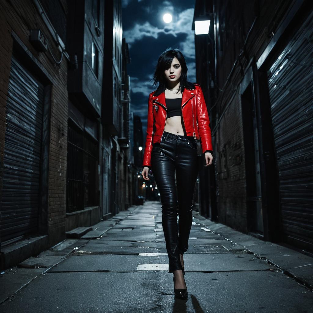 A young woman with wild neon pink hair walks confidently down a dark city alley at night. She wears a red leather jacket, black crop top, black leather pants with knee pads, and black high-heeled boots. The scene features moody moonlight filtering through dark clouds, detailed urban textures, and realistic lighting that highlights the subject's edgy cyberpunk style.