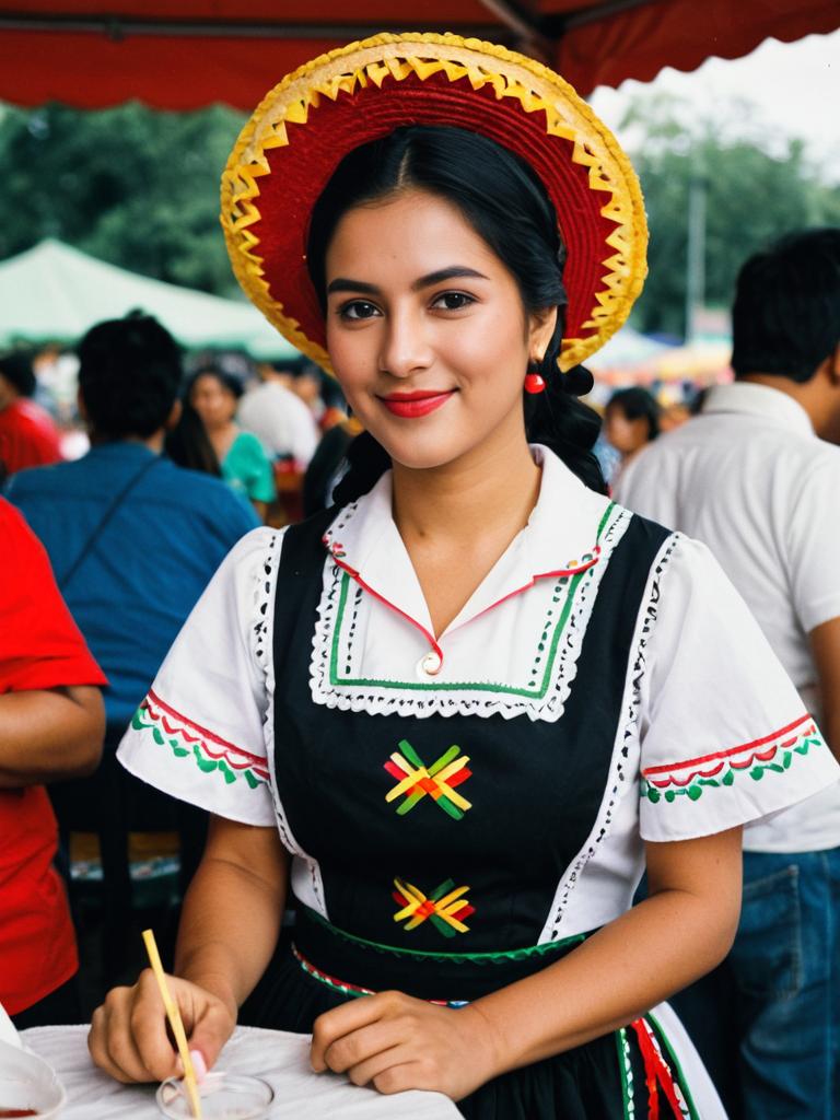 Portrait of a smiling young woman wearing a traditional Mexican waitress costume with a straw hat and floral embroidered apron. She sits at an outdoor festival table with food, surrounded by other attendees in a lively setting.