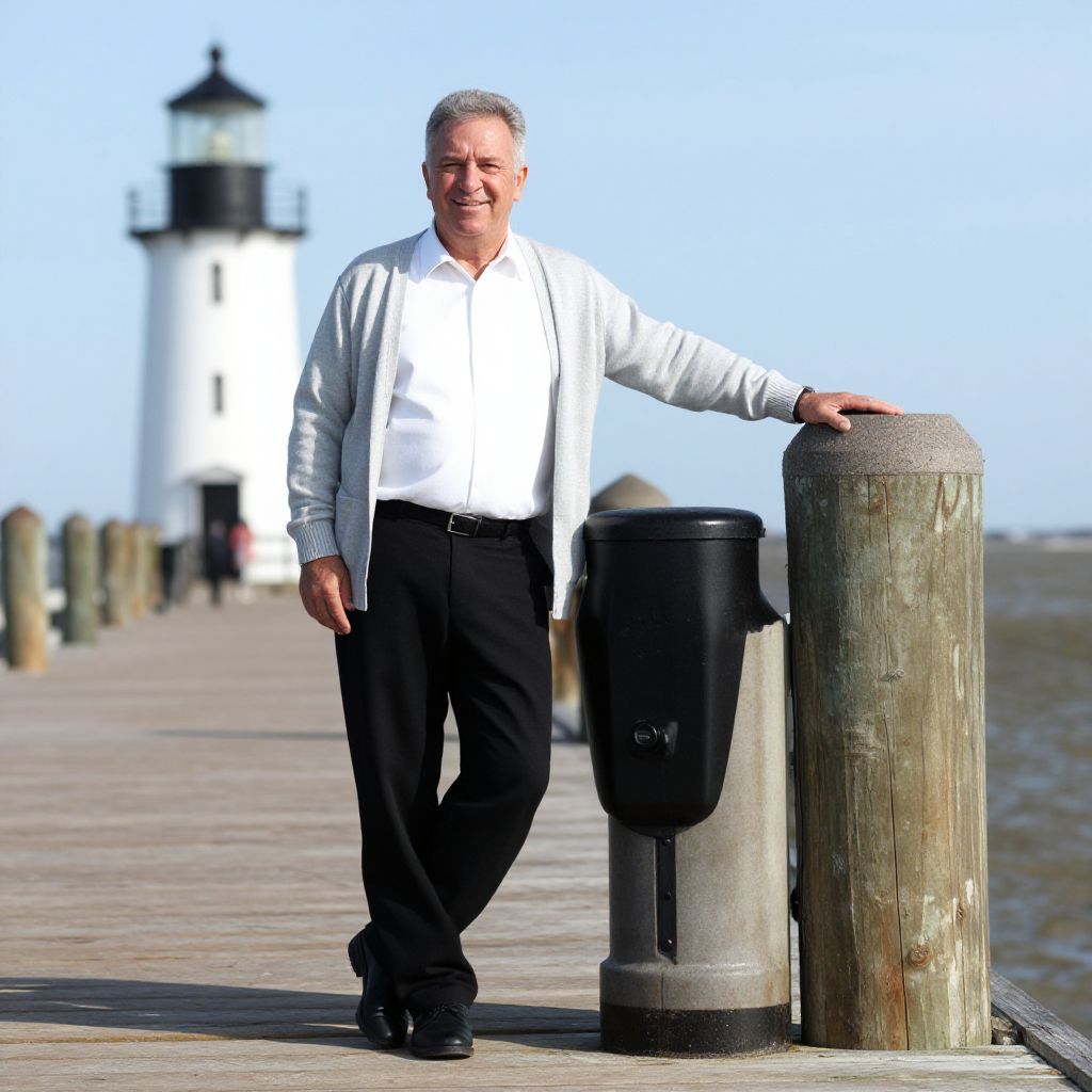 A photograph of a middle-aged man with short gray hair and a friendly smile, standing on a wooden pier. He's wearing a white shirt, black pants, and a light gray cardigan, with black shoes. He leans on a weathered wooden post, with a white lighthouse in the background. The sky is clear and bright.