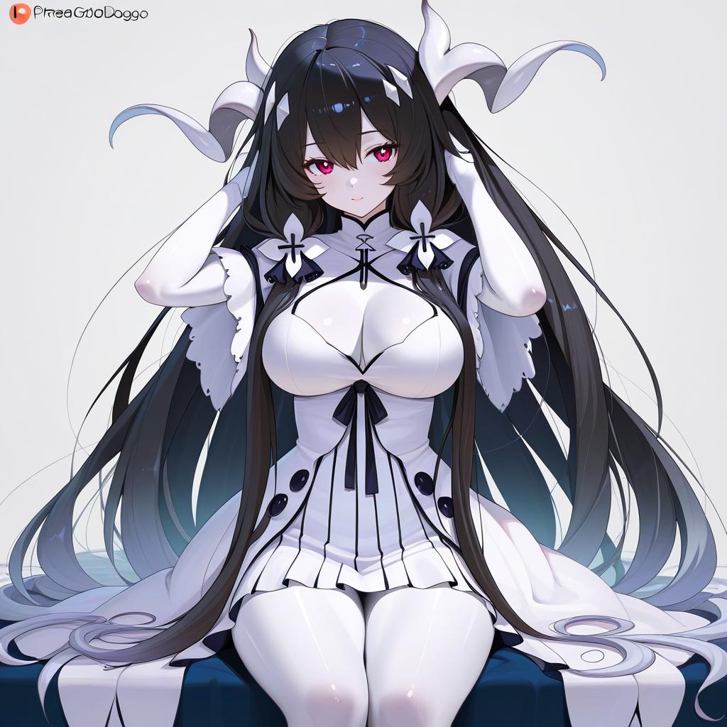 Anchorage water oni, kantai collection, 1girl, white skin, pale skin, horns, red eyes, black hair, very long hair, long hair, gradient hair, white dress, by artist mizuki makoto, illustrious